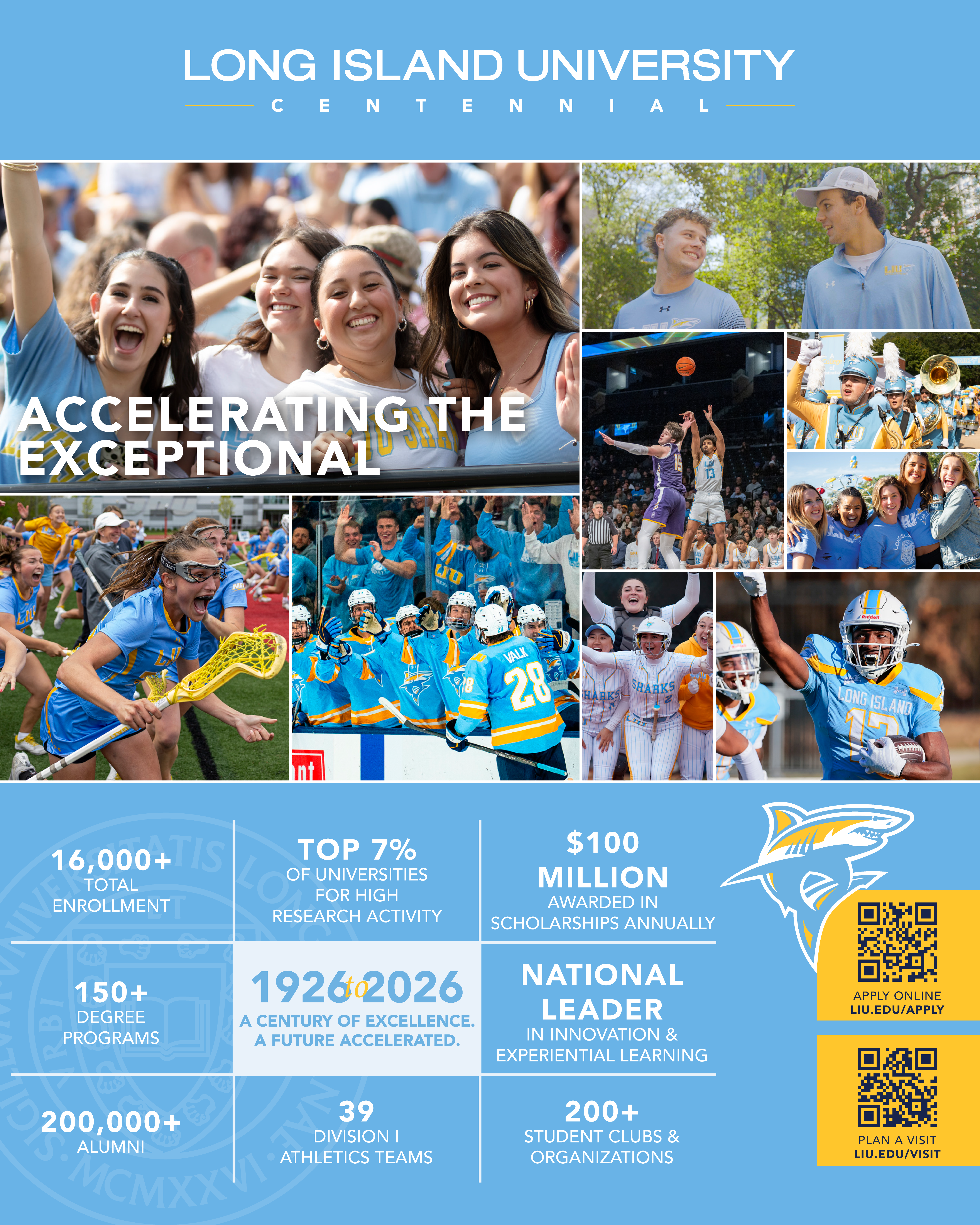 Long Island University, founded in 1926, celebrates a century of academic excellence, innovation, and impact. Established to expand access to high-quality education, LIU is now ranked among the top 7% of universities in the United States for research. With more than 150 academic programs across campuses in Brooklyn and Brookville, LIU combines rigorous academics with experiential learning led by world-class faculty. Recognized by Forbes for its emphasis on hands-on learning and by the Brookings Institution for its “value added” to student outcomes, LIU prepares graduates for leadership and success. A vibrant campus community includes 200+ clubs and organizations and 39 NCAA Division I teams. LIU’s global network of more than 200,000 alumni includes innovators, entrepreneurs, and leaders shaping industries around the world.